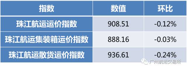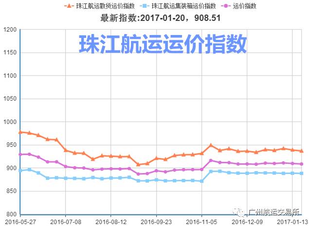 本周,珠江水系航运市场闲置运力较多,节前淡季特征突显,呈现供需两弱格局,整体运价低位徘徊。珠江水系集装箱和散货运价指数双双低位下探,拖累珠江航运运价综合指数弱势下行。2017年1月20日,广州航运交易所发布的珠江航运运价指数报收908.51点,较上个报价周期下跌0.12%。