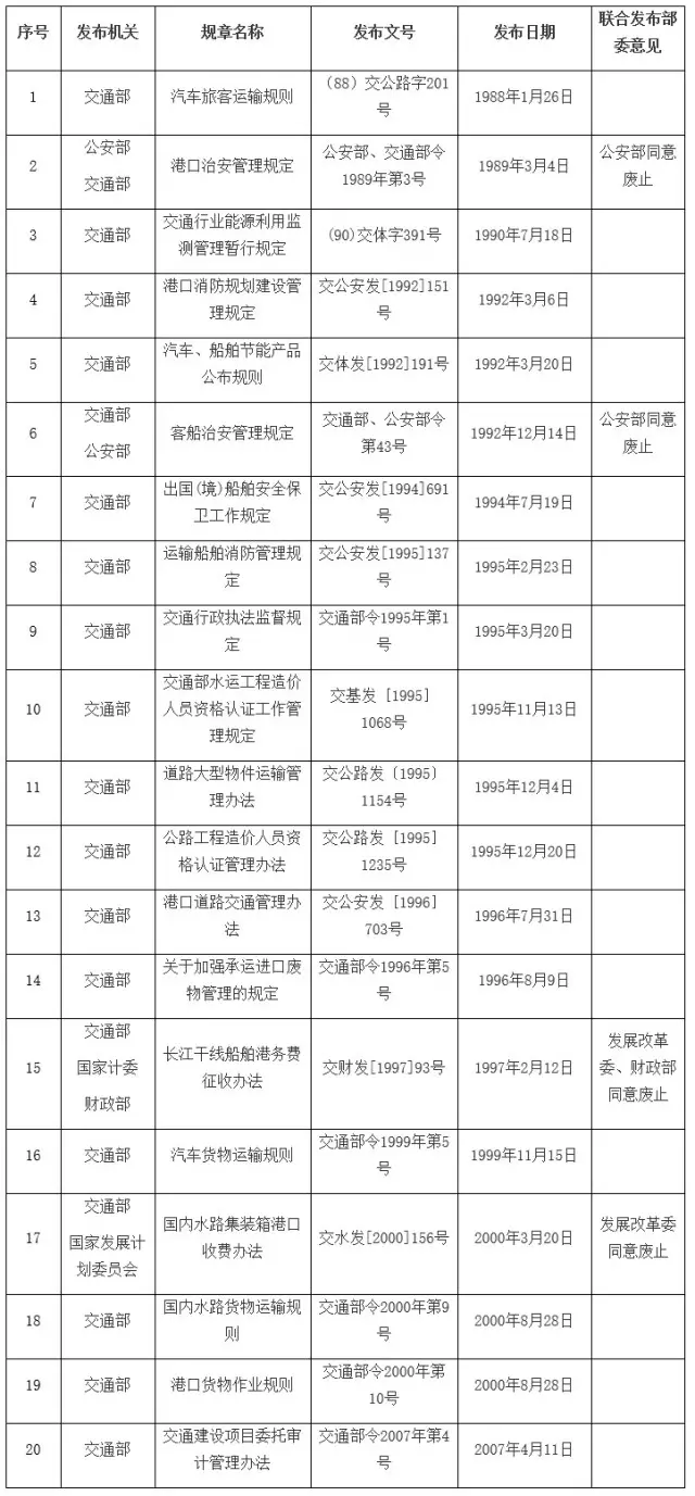 日前,交通运输部发布了《交通运输部关于废止20件交通运输规章的决定》(交通运输部令2016年第57号),废止20件规章的背景是,按照《国务院办公厅关于做好行政法规部门规章和文件清理工作有关事项的通知》(国办函〔2016〕12号)要求,我部组织对现行有效的交通运输规章进行了清理。经过清理,对20件发布时间较久,主要内容已与上位法规定不一致、不适应交通运输改革形势发展需要、不符合简政放权和政府职能转变要求或超越部门规章权限的规章予以废止。其中,所废止的与其他部委联合发布的规章,已取得了相关部委的同意。