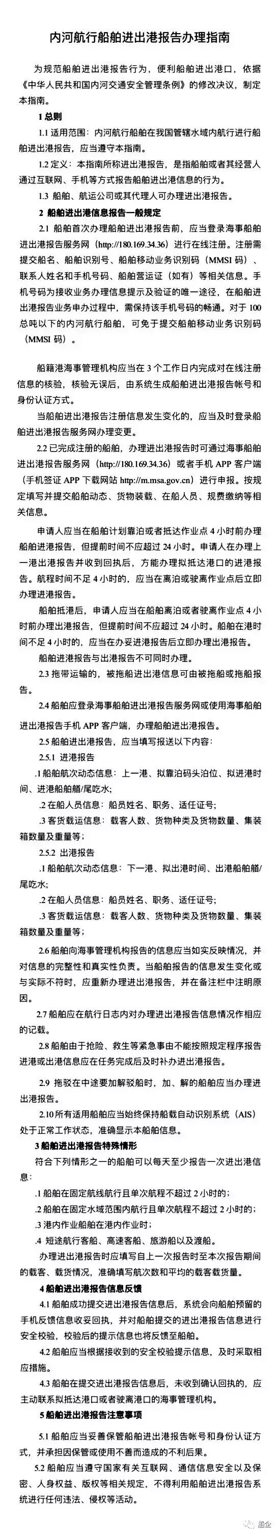 通知指出,航行于长江、珠江、黑龙江、京杭运河的四级以上高等级航道的内河船舶和进入内河航行的海船,通过互联网远程登录海事船舶进出港报告服务网或手机APP客户端,即可办理进出港报告。航行其他水域的内河船舶可根据各省级海事管理机构制定的规则办理进出港报告。交通运输部海事局已专门制作了海事管理机构船舶进出港报告通讯录,并在交通运输部海事局官方网站和船舶报告服务网上公布。