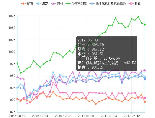2017年6月9日,广州航运交易所发布的珠江航运散货运价指数报收943.53点,较上个报价周期下跌0.68%。其中,钢材运价持续回升,煤炭、矿石和沙石自卸船运价回落,粮食运价企稳。